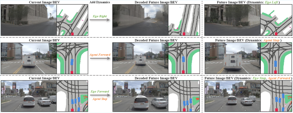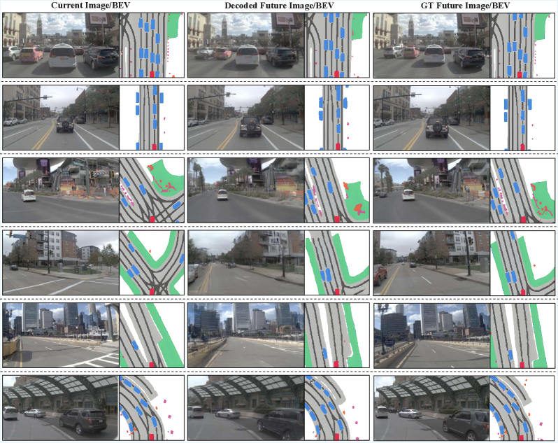 Figure 7: The DynVLA Dynamics Tokenizer accurately decodes future images and BEV maps, demonstrating its ability to capture both ego-motion and surrounding object dynamics.