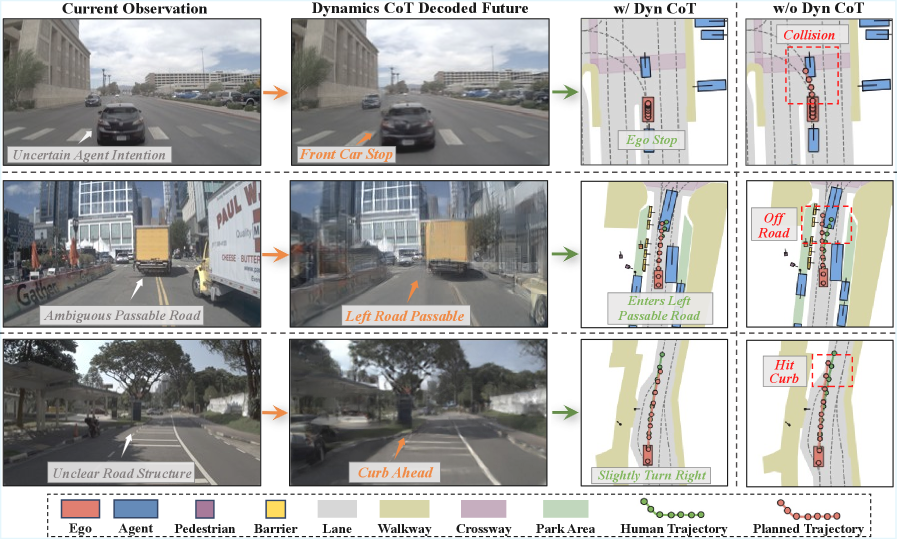 Figure 6: Dynamics CoT allows for more foresighted and safer planning by explicitly reasoning about future dynamics, preventing potential collisions.