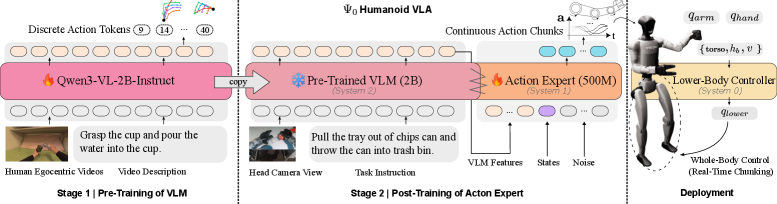 Figure 2: Model Training and Deployment: First, we pre-train the VLM on the EgoDex [20] dataset to autoregressively predict the next-action tokens in the task space. Then, we post-train the flow-based action expert using robotic data to predict action chunks in the joint space. Finally, we implement a real-time chunking mechanism that leverages the lower-body controller to achieve smooth whole-body control.