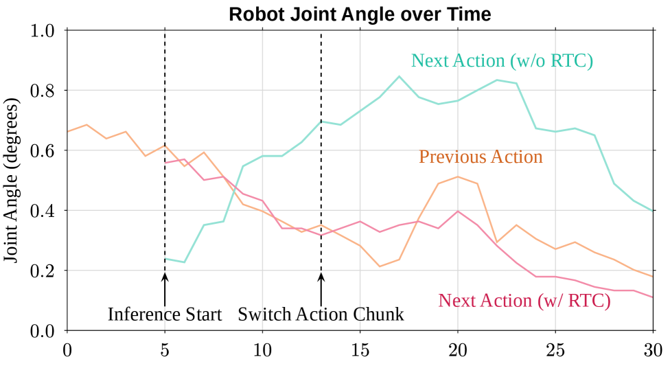 Figure 4: Real-Time Chunking: Given that the previous action is being executed (yellow line), the next action can diverge significantly (cyan line) without RTC, which leads to control jitter. With RTC (red line), the divergence between two consecutive actions is strongly suppressed, resulting in smoother and more stable behavior.