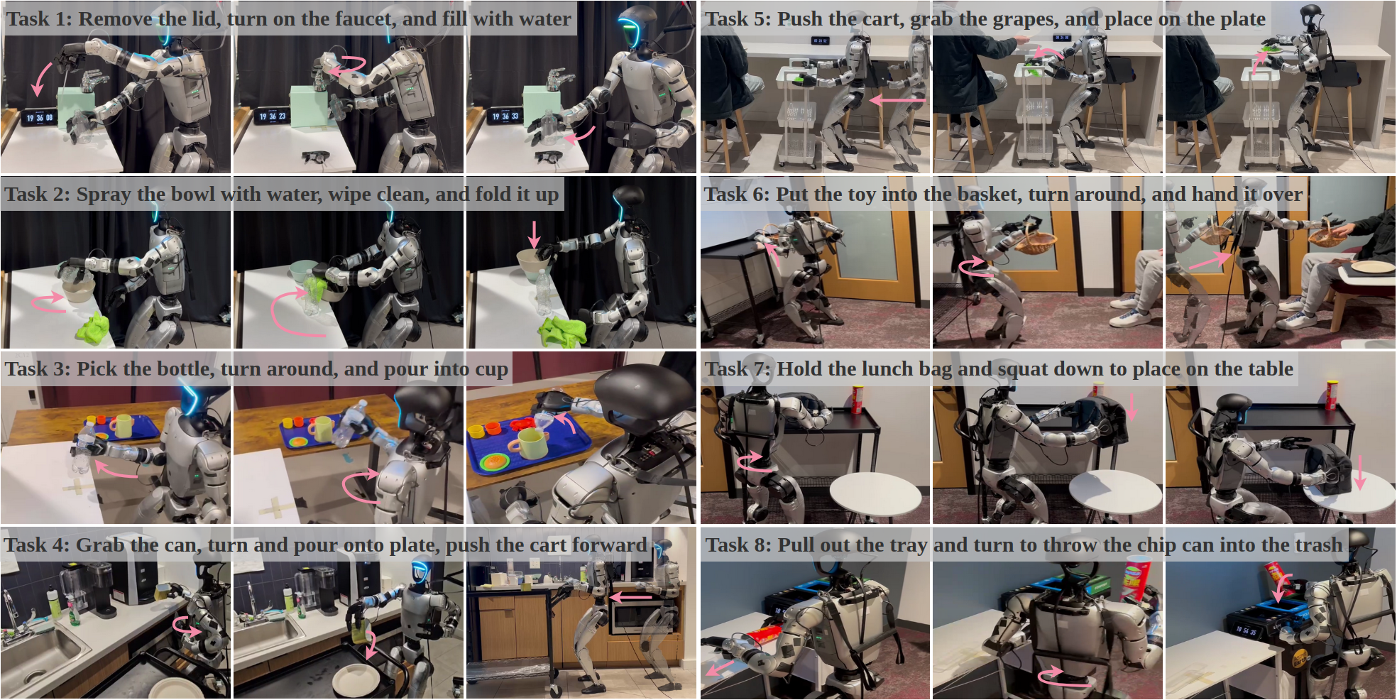 Figure 6: Real-World Task Setup: We evaluate Ψ0\Psi_{0} on eight diverse long-horizon dexterous loco-manipulation tasks involving manipulation, whole-body motion, and locomotion. The task instruction is overlayed on the task images and each sub-task is denoted with marker for better visualization. Our policy rollout videos are included in the Supplementary Materials.