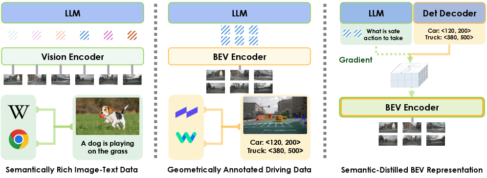 Figure 1: Representation Comparison: Left: Vision encoders can leverage widely available semantically rich image-text data, but process multi-view images independently. Center: Bird’s-Eye View (BEV) encoders provide a spatially consistent scene representation, but are limited to geometrically annotated data. Right (ours): We propose the semantic distillation from LLMs to BEV encoders to build a semantic-enhanced and spatially consistent scene representation.