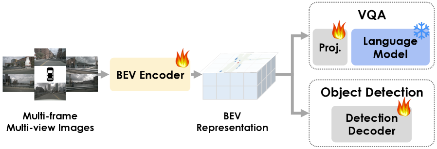 Figure 3: BEV Semantic Distillation: We distill the knowledge from the language model to the BEV representations by using Visual Question Answering (VQA) tasks while regularizing BEV spatial structure using the original object detection tasks.