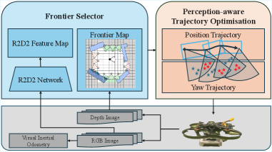 Figure 2: The perception-aware exploration framework consists of two main components: a frontier selector and perception-aware trajectory optimization.