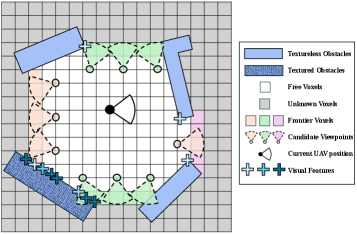 In real-world experiments, the drone successfully explored rooms with mostly blank walls, actively turning to keep an eye on textured obstacles or corners to ensure reliable state estimation. (See Figure 10 for a visual of this in action).