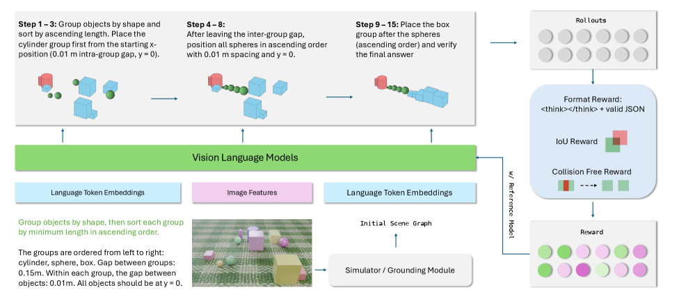 Figure 3: Overview of our training pipeline. The vision-language model predicts step-by-step layout edits from the instruction and initial scene graph, and rollouts are optimized using a combination of format, IoU, and collision-free rewards.