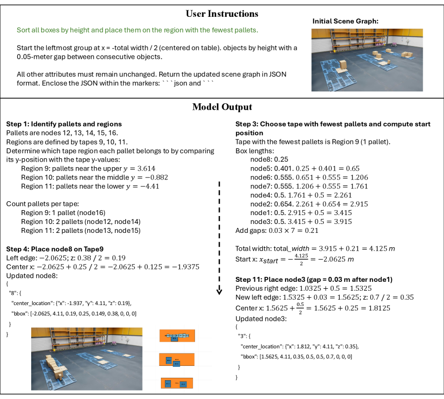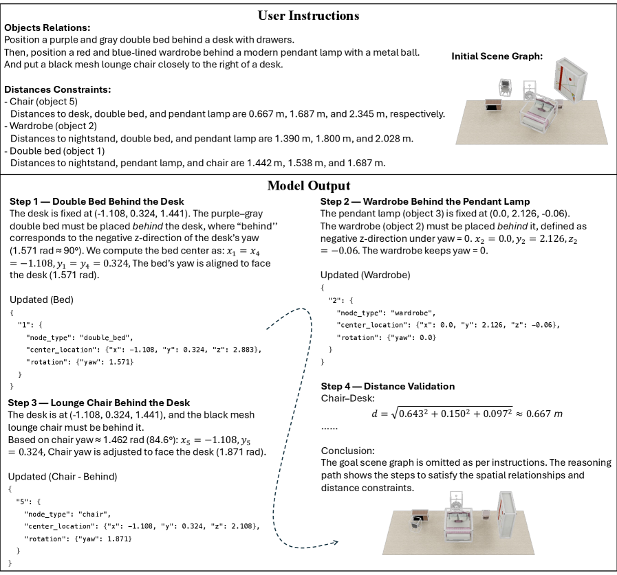 This structured approach allows the model to handle complex instructions that involve multiple spatial constraints, as demonstrated in room layout reasoning, where it can interpret and validate distances between objects.