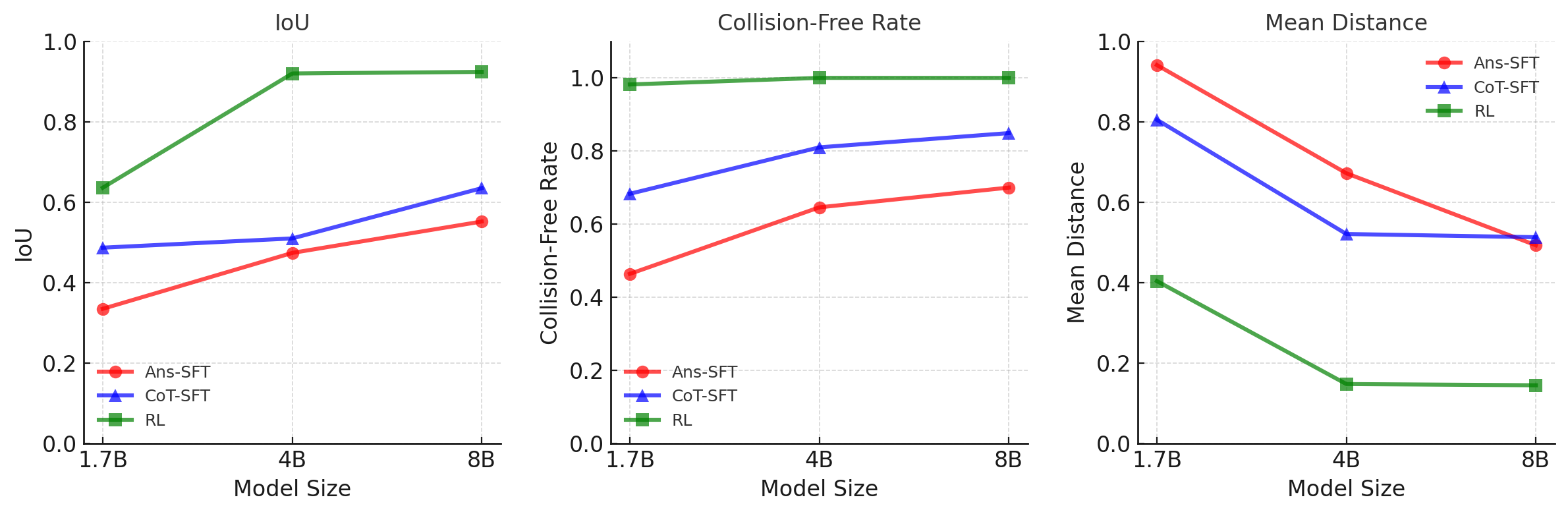 Figure 8: Scaling behavior on the Sorting benchmark. Reasoning-based training improves performance consistently across all model scales (1.7B–8B).