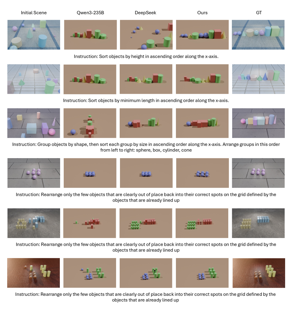 Figure 9: Qualitative comparison of sorting and spatial alignment tasks: Qwen3-235B and DeepSeek often fail to follow the instructions and produce collisions/overlaps, while our method matches the ground truth.