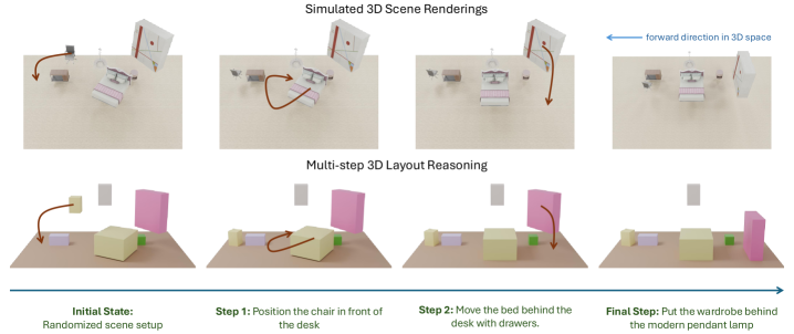 Figure 4: Example of text-guided 3D room layout reasoning, showing how the model interprets constraints to update object poses step by step and validate distances.