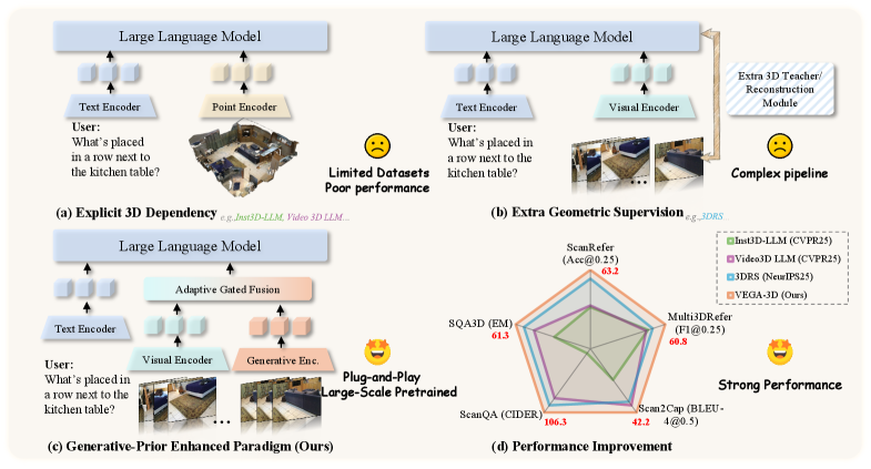 Figure 1: Unlike methods relying on (a) explicit 3D inputs or (b) complex geometric supervision, (c) our VEGA-3D extracts implicit priors from video generation models. By repurposing them as Latent World Simulators, we achieve (d) superior performance without external 3D dependencies.