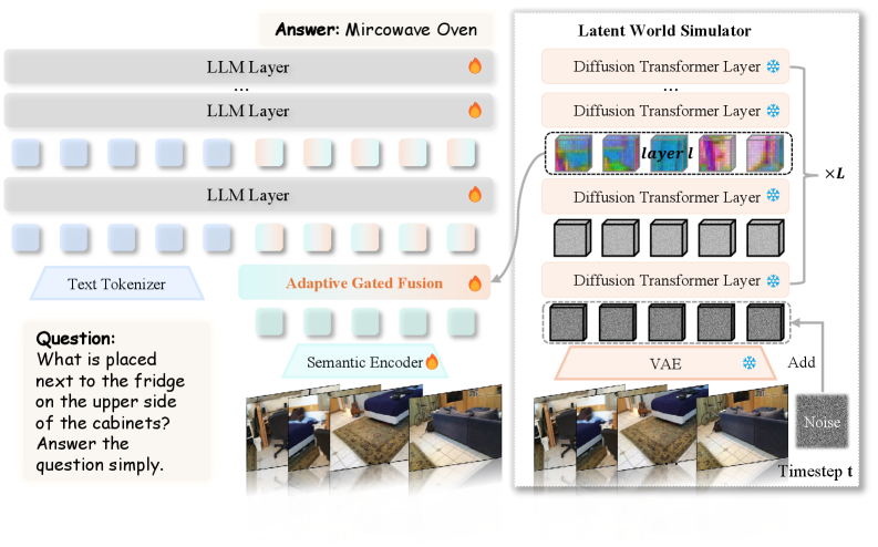 Figure 4: Overview of the VEGA-3D framework. We repurpose a frozen video generation model as a Latent World Simulator to extract implicit 3D priors. These features are dynamically integrated with the semantic stream via Adaptive Gated Fusion, equipping the MLLM with dense 3D structural awareness.