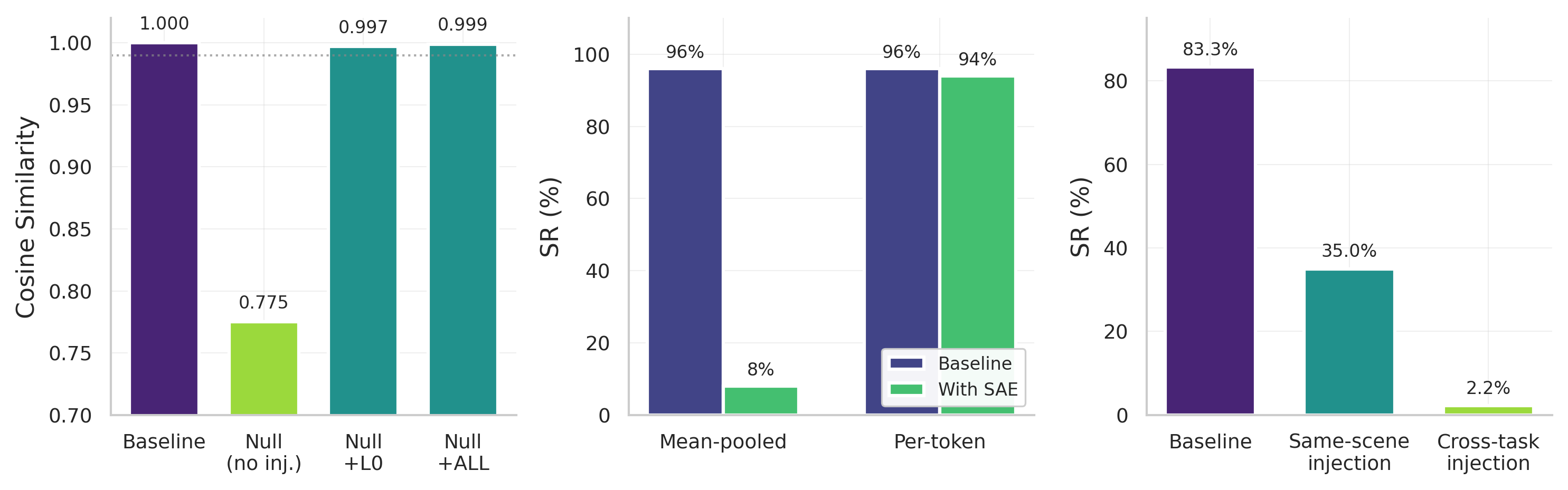 Figure 1: Three core findings on π0.5\pi_{0.5}. Left: Activation injection recovers baseline behavior from null-prompt episodes. Without injection, null prompts drop cosine similarity to 0.775; injecting a single layer (L0) recovers 0.997 and all layers recovers 0.999, demonstrating visual pathway dominance. Middle: Per-token SAE processing is essential. Mean-pooled SAE reconstruction destroys task success (96%→\to8%) despite high explained variance, while per-token processing preserves performance (96%→\to94%). Right: Cross-task injection fails destination tasks (83.3%→\to2.2%) and same-scene injection partially succeeds (35.0%), confirming spatially bound motor programs. These patterns replicate across all six models (Table 6).