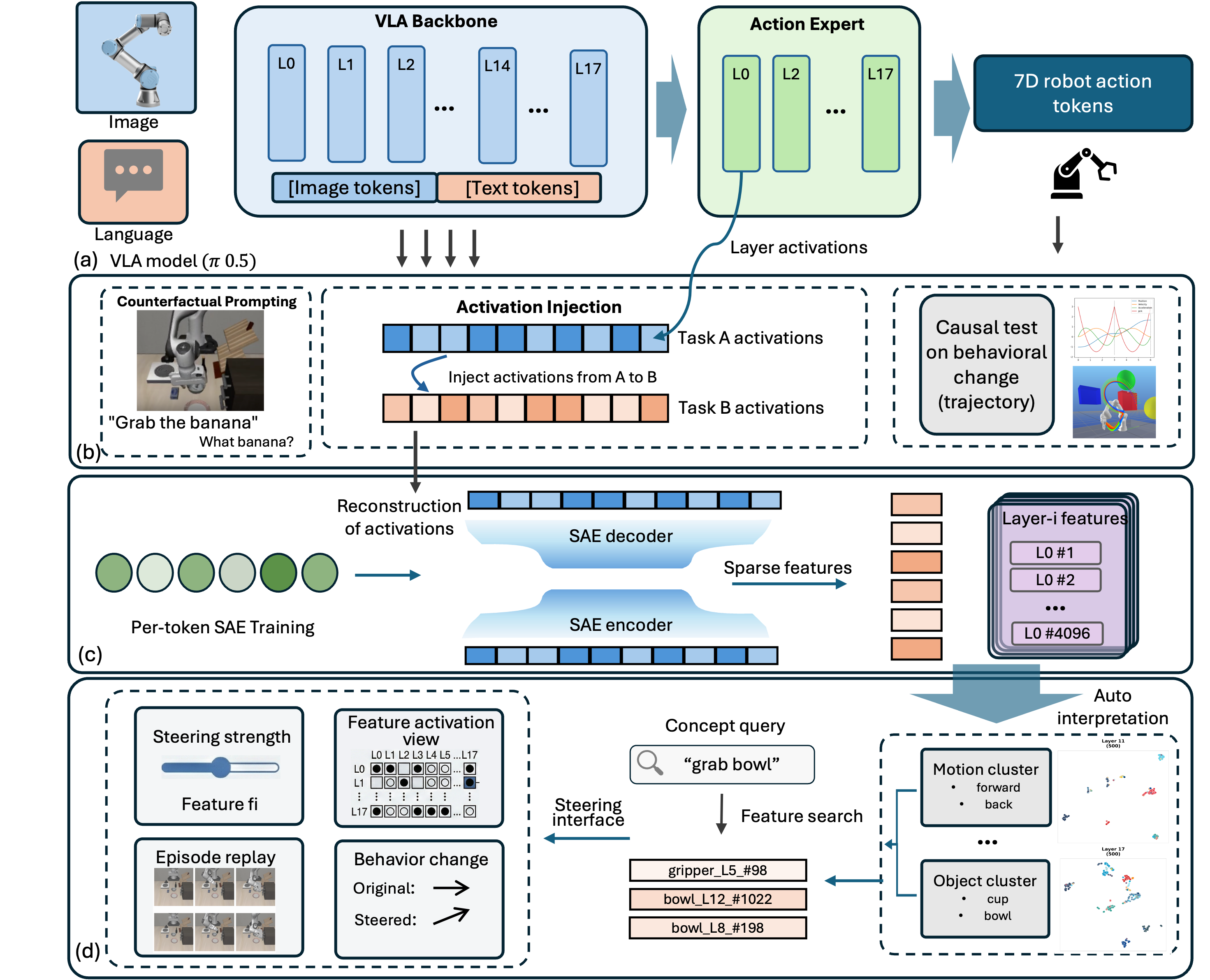 Second, they employed Sparse Autoencoders (SAEs) to decompose complex layer activations into sparse, interpretable features. This is akin to breaking down a blurry image into its sharpest, most meaningful components. This enabled them to identify discrete "concepts" within the model's internal representations. Finally, linear probes identified what specific parts of the model encode, such as goal semantics or motor programs. The team then validated these findings through causal ablation, selectively turning off identified features to observe the behavioral impact. All these findings are publicly explorable through their Action Atlas tool.