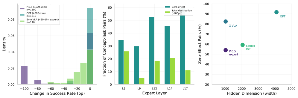 82+manipulation concepts. Causal ablation revealed sensitivity ranging from28-92%zero-effect rates. This implies that while some concepts are critical (like "put" or "open"), many features can be removed without affecting behavior, independent of the representation width.