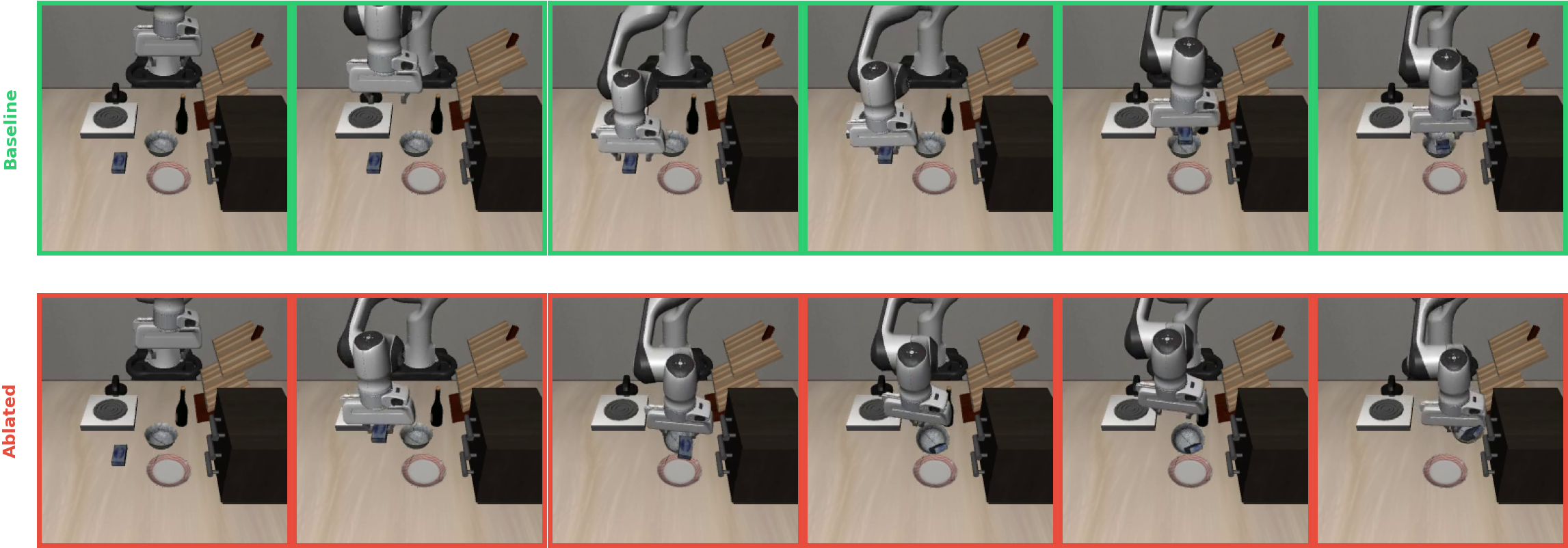 Figure 5: PUT concept ablation (L8): “Put the cream cheese in the bowl.” Top (green): Baseline. The robot picks up the cream cheese and places it in the bowl (91 steps). Bottom (red): With PUT features zeroed at layer 8, the robot drops the cream cheese into the bowl, knocking it over (300 steps, task failure).