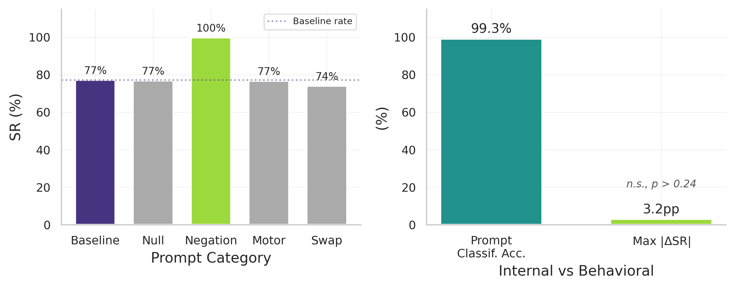 Figure 10: Language is ignored despite internal distinction. Left: counterfactual prompting across 3,396+ episodes shows no significant behavioral difference (p>>0.24). Right: layer 17 classifiers distinguish prompts with 99.3% accuracy, yet behavior is unchanged.
