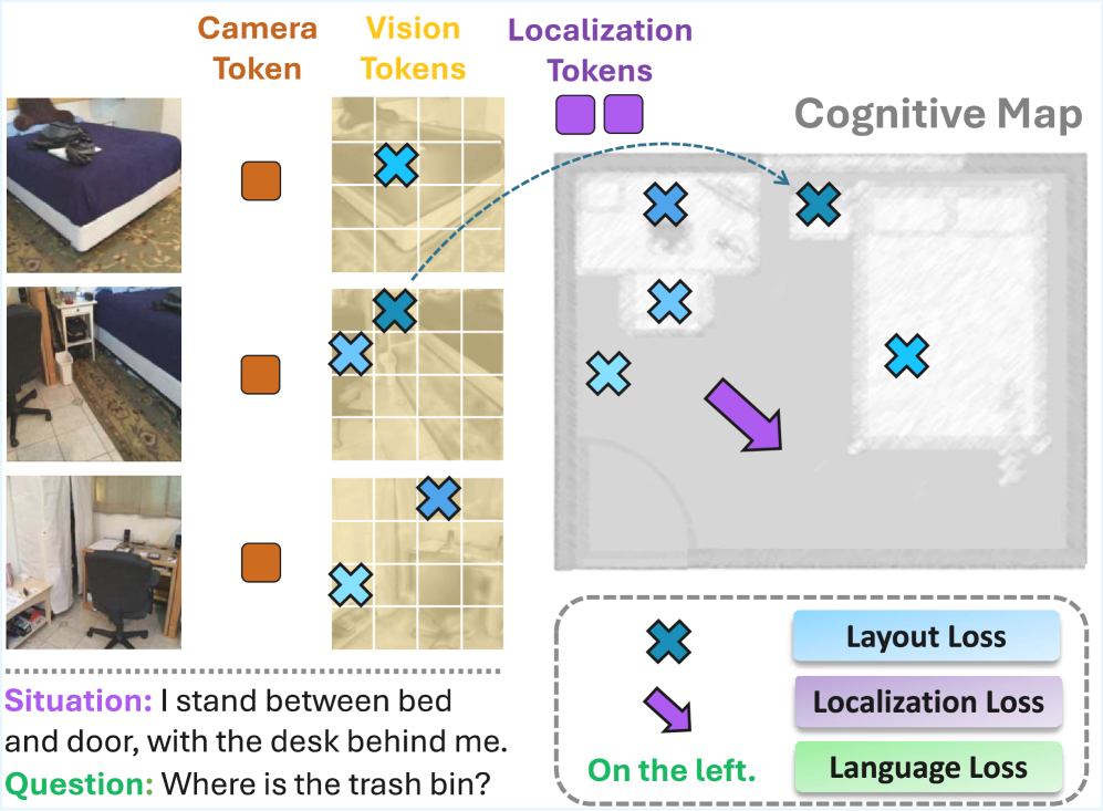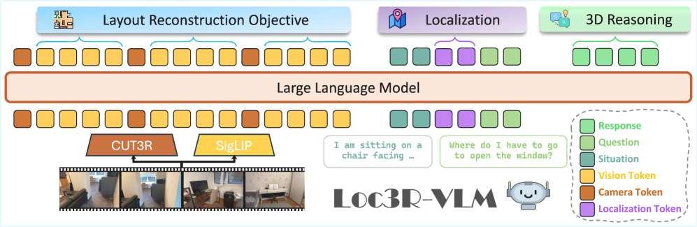 Figure 2: Overview of Loc3R-VLM. The framework uses monocular video and augments vision tokens with camera pose priors. It's trained with layout reconstruction and situation modeling objectives to enable viewpoint-aware 3D reasoning.