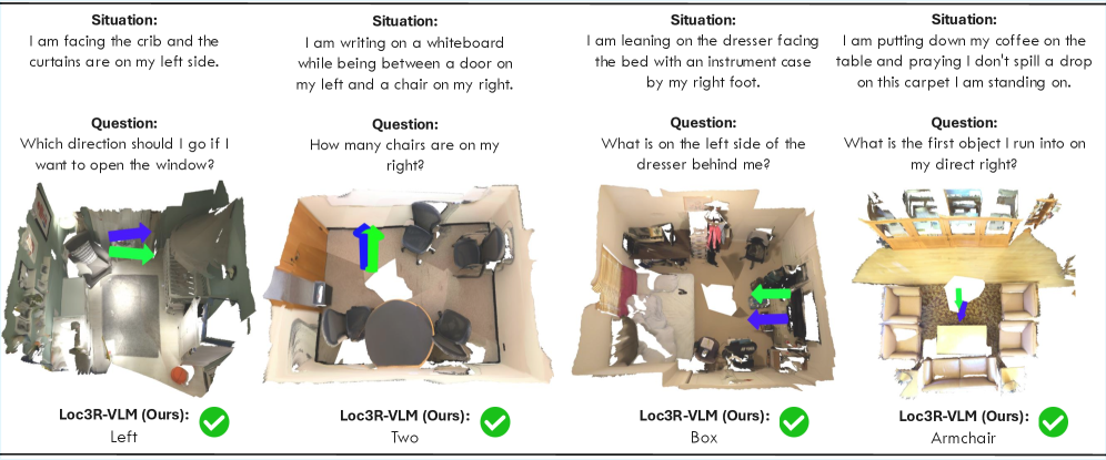 Figure 4: Qualitative Results for language-based localization and situated QA. Loc3R-VLM accurately grounds described situations (blue: prediction, green: ground truth) and provides correct viewpoint-dependent answers.