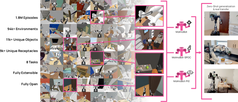 The MolmoB0T team proposes a bold solution: overcome the sim-to-real gap by massively scaling up the diversity and quantity of simulated training data. Their custom-built MolmoBot-Engine generates MolmoSpaces—highly diverse virtual environments filled with procedurally generated objects and tasks. These environments are used to create MolmoBot-Data, a dataset of 1.8 million expert trajectories for tasks like pick-and-place and object manipulation.