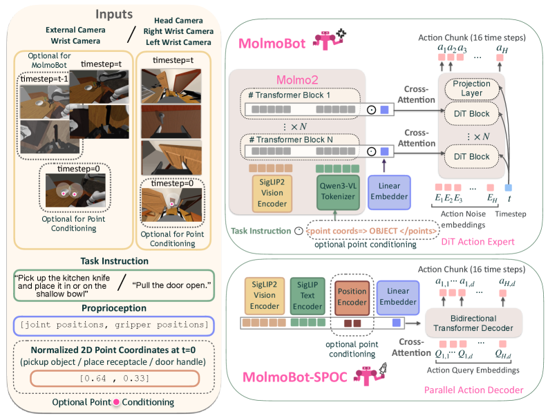 MolmoBot: A multi-frame vision-language model that processes camera views, proprioceptive data, and language instructions to predict actions.MolmoBot-Pi0: A baseline model replicating theπ_0architecture for comparison.MolmoBot-SPOC: A lightweight policy designed for resource-constrained platforms like drones, with potential for fine-tuning.